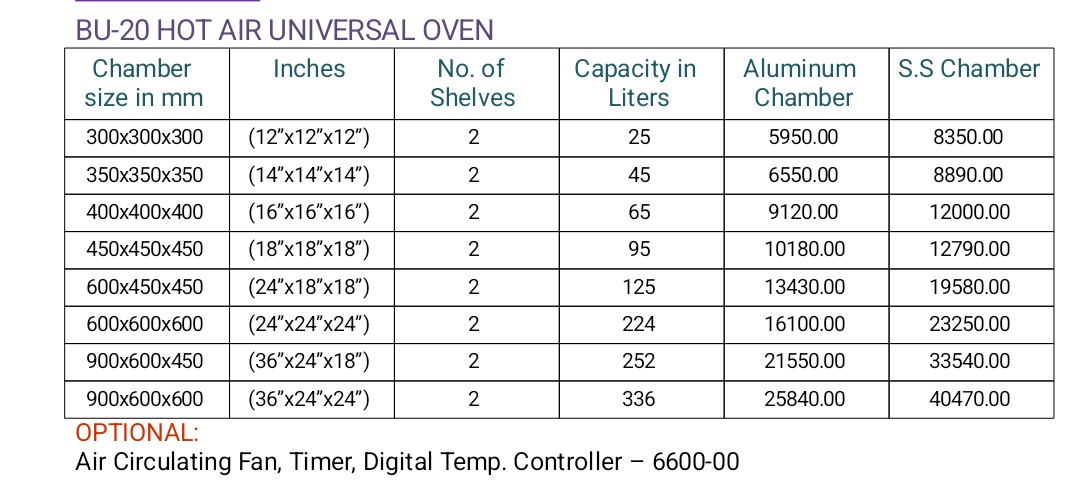 uniform heating in range of 50°C to 200°C, controlled by capillary type of thermostat. L-shaped thermometer is built in type. Control panel is provided with selector switch of high or low rates of power thermostat control Knob and indicators for mains and thermostat. Supplied with cord and plug.