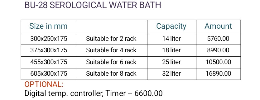 Temperature range ambient temperature to 80°C. Thermostatic control with accuracy of ± 0.5°C to 1°C Double walled, inside stainless steel and outside mild steel painted in epoxy powder coating. Bath consists of two pilot lamps. Temperature control knob and on/off switch. Supplied with or without stirring arrangement, without racks and thermometer. Lid of water bath is mad of stainless steel sheet.