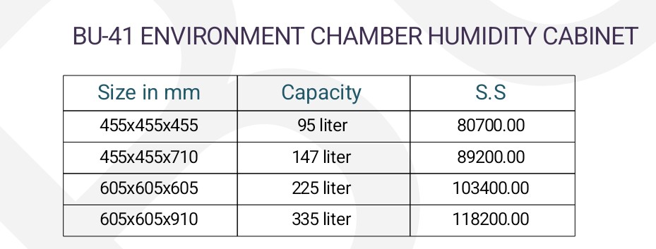General specifications as above but with added specification for low temp. control & humidity. The inner working chamber is made out of stainless steel. The temperature can be controlled from 5°C to 55°C ±2°C and humidity from 55% to 95% ± 5% RH through an electronic digital controller-cum-indicator.