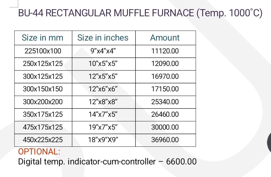 Maximum temp. 1000°C with working temp. 940°C controlled by energy regulator.