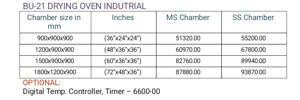 Standard sturdy double wall fabrication. Inner and outer chamber made out of thick mild steel sheet. Inner chamber backed silver paint finish and exterior finished in hammer tone heavy duty forced air blowers are provided to constantly circulate hot air to achieve uniform temp. in the whole chamber. Double wall door is mounted on heavy hinges and provided with heavy molded latch. Temperature is controlled by a thermostat and it can be read on dial type thermometer. Temperature range: 50°C to 250°C.