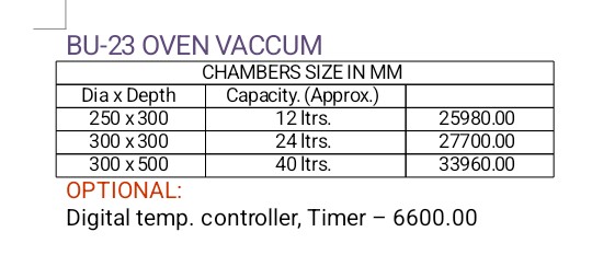 50°C to 130°C. The body capable of withstanding vacuum of 760 mm hg. Workable on 220 V AC single phases. Supplied without vacuum pump.