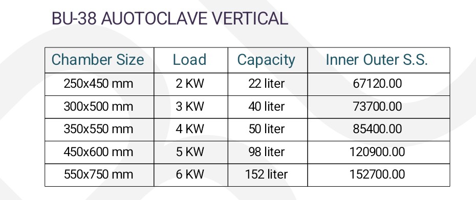 A versatile, electrically heated heat sterilizer under saturated steam of adjustable pressure of 10 to 20 psi. Double walled construction with boiler and steam jacket made of thick stainless steel and gas is filled with high grade glass wool to bring the temp. loss to a minimal level. The outer chamber is made out of thick mild steel. The lid is made of thick stainless steel plate(Joint less) or gunmetal plate and can be sealed by a joint less neoprene rubber gasket nay wing nuts through hinged bolts by engaging slotted plugs on rim of the cover.