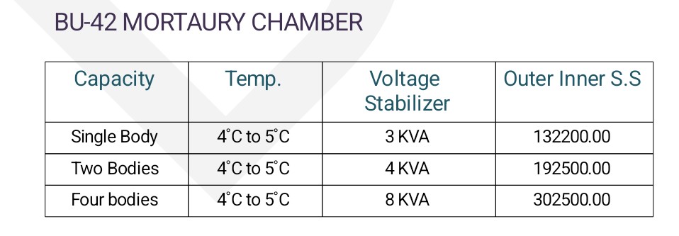 Designed to store cadaverous under cool conditions to prevent decomposition. Double walled construction, outer made out of thick mild steel sheet duly finished in stoving enamel paint and inner made out of stainless steel sheet. The gap between the two is filled with glass wool for temperature insulation. Front opening covered with double walled door with magnetic gasket, lock & key and handle. Individual chambers are provided with independent locks with duplicate keys.