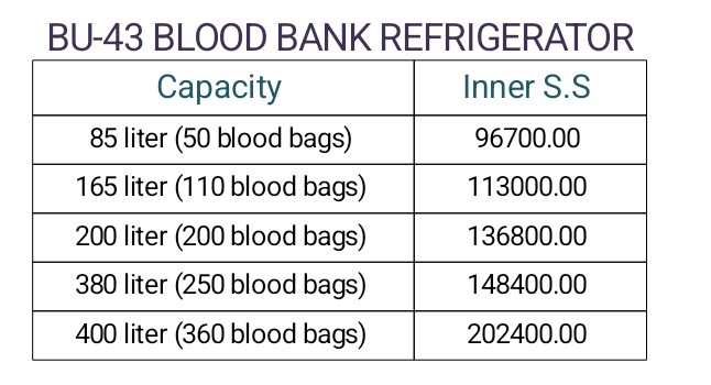 Temperature between 4°C to 6°C is maintained by a digital temp. controller-cum-indicator and trigger audio-visual alarm in case of temp. fluctuations. A door operation alarm is also provided along with power failure alarm as a safety device. Drawers with index cards have been provided to hold bold bottles or blood bags. A sealed compressor unit and cooling coils running throughout the chamber are provided for thermal uniformity.