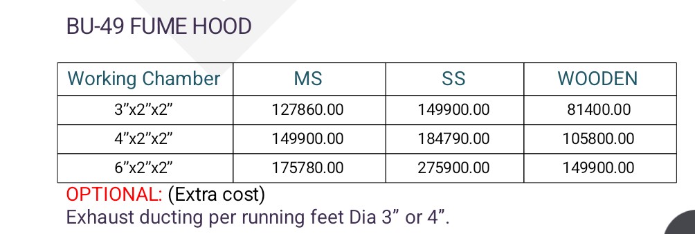 Fume exhaust hood are designed to contain and throw out toxic, obnoxious, pungent smelling gases to protect personnel and equipment in the laboratories. A motor driven dynamically balanced blower with minimum vibration and noise level, creates negative pressure and sucks contaminated air from work area and throws the same in high-up atmosphere through ducting. Fabricated out of thick ply-board clad from outside in laminated sheet and inside finished in non-corrosive, chemical resistant EPOXY paint. An up-down sliding sash made of teak wood mounted in thick glass is provided. Fluorescent lighting provided in the chamber. A gas tap and a power plug is also provided. Stainless steel wash basin and suitable water tap is also provided to hood at a suitable level from ground.